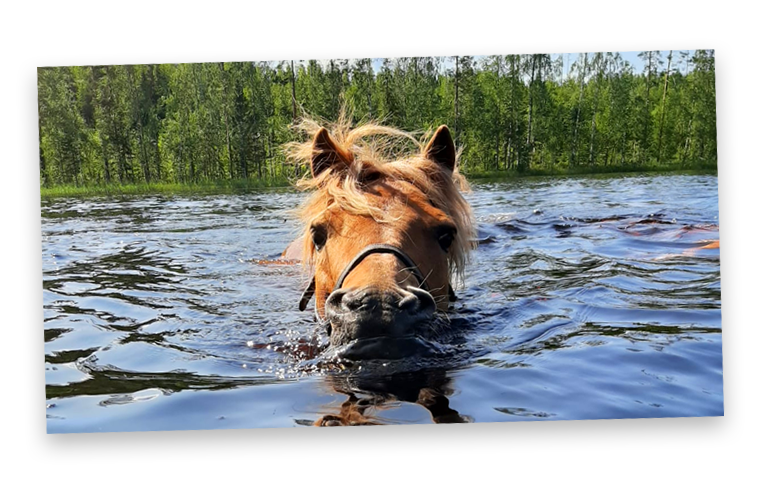 Uimaranta on lyhyen kävelymatkan päässä. Toisinaan leiriläiset mielivät uimaan jopa kolmekin kertaa päivässä, mikäs sen mukavampaa kuin pulahtaa viilentävään jokeen! Leiriläisillä on parhaina leirikavereina lauma ihania hevosia ja poneja, joiden kanssa on kiva ratsastaa ja opetella taitavaksi hevosenkäsittelijäksi. Jokaiselle tietysti löytyy oma hoitohevonen. Lisäksi pääset seuraamaan ajohevosten treeniä, ratsastustunteja, varsojen iloittelua, kengittäjää ja hevoshierojaa työssään.